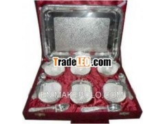 Beautiful gift for collectorApple Fruit shape silver plated designer sixbowl along with spoon each and a tray. Beautifully decoratedwith floral carvings to give a traditional look.Exclusiveutility item to serve your guest in style. A classy gift item forall occasions. Comes in a velvetcovered wooden box (Just like a piece ofJewel).