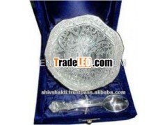 Thisdesigner silver plated bowl along with a spoon with intricatedesign. Beautifully decorated with floral carvings to give a traditionallook. A must have accessory for your dining table. Exclusive utility item to serve your guest in style.A classy gift item for all occasions.