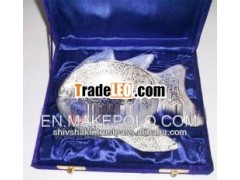 Fish shape silver plated designer bowl along with a spoon.Beautifully decorated with floral carvings to give a traditionallook. A must have accessory for your dining table. Exclusiveutility item to serve your guest in style. A classy gift item forall occasions. Comes in a velvet covered wooden box (Just like apiece of Jewel).